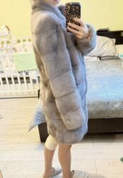 Шуба из норки, цвет дымчато‑голубой (серо‑сиреневый подтон). Характеристики: - Натуральный мех норки, поперечная раскладка пластин - Свободный силуэт до середины бедра - Объёмный капюшон - Застёжк...