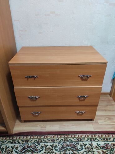- Комод компактный, с 3 выдвижными ящиками. Цвет — светлое дерево (бук/ольха). Прямоугольная столешница, металлические ручки на каждом ящике. Удобен для хранения белья, одежды и мелочей; подойдет для спальни, детской или прихожей.