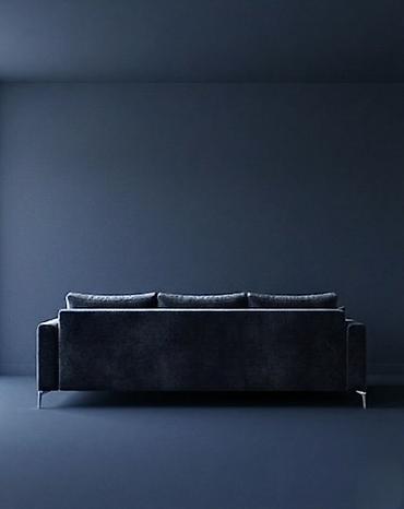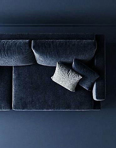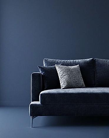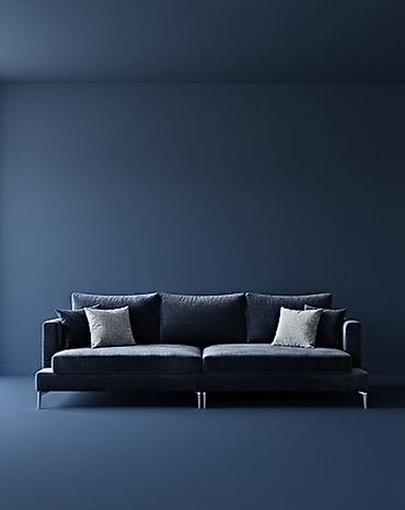 - Цветовая палитра: глубокий тёмно‑синий диван с контрастными светлыми подушками.