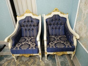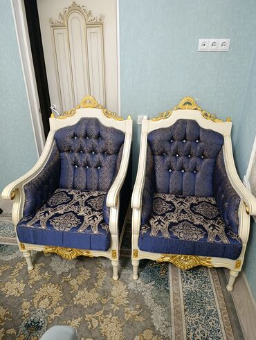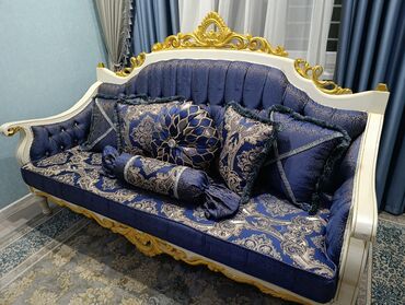 - Обивка: плотный жаккард глубокого синего цвета с сложным орнаментом.