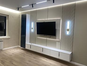 - Дополнительно: изготовление и подсветка ТВ-панелей и консольных тумб, монтаж стеклянных витрин/шкафов с подсветкой, оформление стен молдингами с золотым кантом и фактурными декоративными покрытиями.