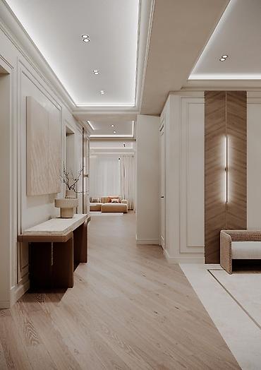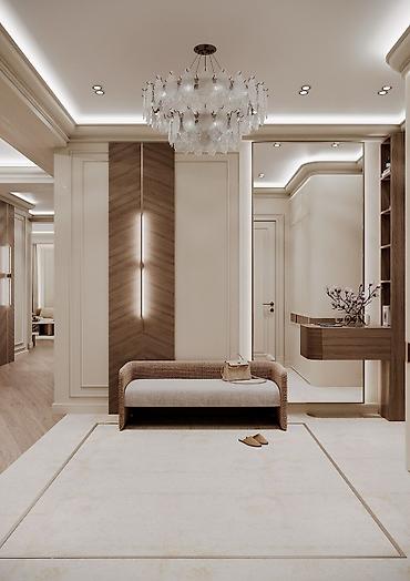 Услуга: дизайн и отделка интерьеров в современном неоклассическом стиле Описание: - Проектирование жилых интерьеров с акцентом на элегантную классику и современные технологии освещения. - Стены: д...