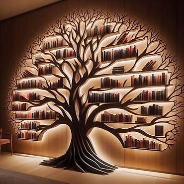 - Индивидуальные решения из дерева и металла: настенные панно и стеллажи сложной формы (например, книжные полки-«дерево» с контурной LED‑подсветкой), модульные системы хранения, кухонные гарнитуры U‑ и L‑образной конфигурации.