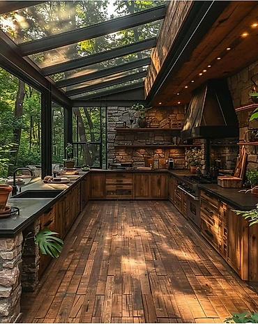 - Проектирование и реализация интерьеров в современном и eco/loft-стиле: гостиные с многоуровневым светом, кухни с панорамным остеклением, камнем и массивом, зонирование уровнями пола, стеклянные ограждения, встроенные очаги.