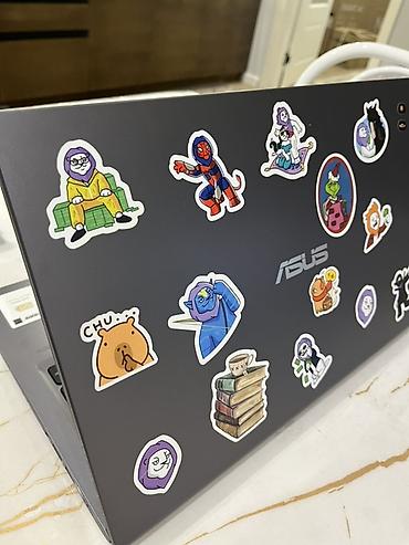 - На крышке и рядом с тачпадом наклейки (декоративные стикеры, видны на фото).