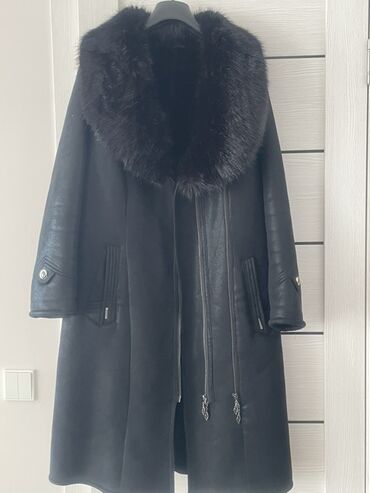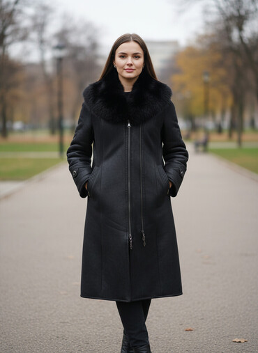 Длинная женская дублёнка черного цвета с объёмным меховым воротником.