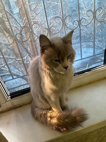 Кошка с длинной пушистой шерстью и роскошным хвостом. Окрас светло-кремовый с более тёмной маской на мордочке и ушках, нос тёмный. Глаза светлые, уши крупные с небольшими кисточками. Компактное, аккуратное телосложение, густой подшёрсток. Спокойный, уравновешенный характер: любит сидеть на подоконнике и наблюдать за улицей, охотно идёт на контакт, ласкова. Подойдёт для домашнего содержания в квартире, хорошо переносит спокойную обстановку.