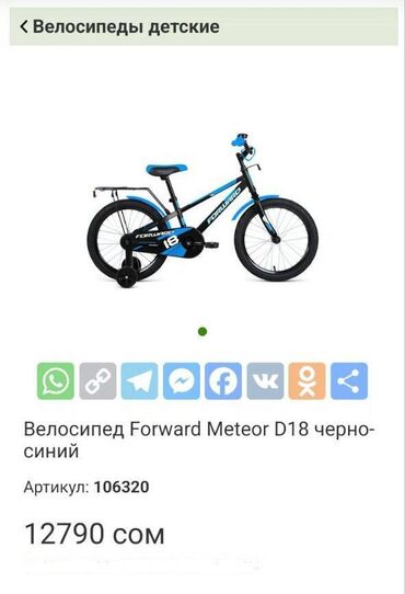 Добрый день. Продается детский велосипед Forward Meteor 18". Состояние БУ два сезона, покупался новым в 2023, ребенок научился кататься и вырос из него. Размер колес 18 дюймов, рекомендуемый рост ребенка 105-130см. Из доп. оборудования есть звонок и задний багажник. Состояние очень хорошее, разумеется, присутствуют следы эксплуатации. В комплекте есть страховочные колеса для помощи удержания юному всаднику велосипеда вертикально, не распаковывались и ни разу не использовались. ВНИМАНИЕ, данная модель велосипеда оснащена ТОЛЬКО задним тормозом, всё как у взрослых.