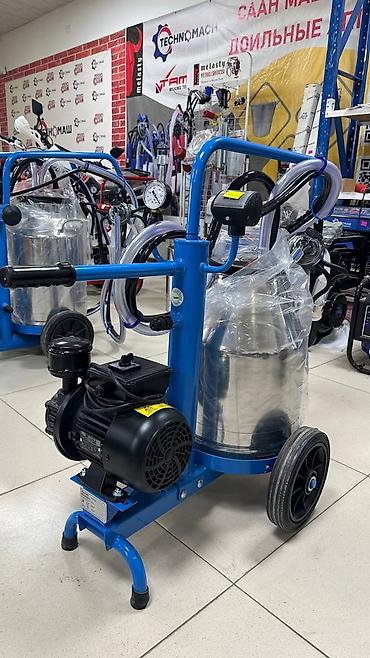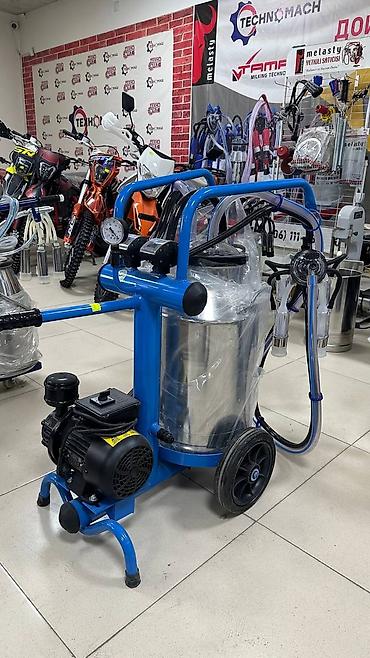 - Комплектация на фото: рама с электродвигателем и насосом, вакуумметр, нержавеющий бидон, комплект доильных стаканов и коллектор, молочные/вакуумные шланги.