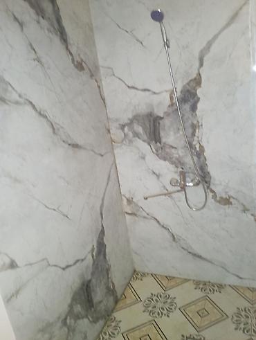 - Внутри: металлическая входная дверь, радиаторы отопления, кафельный пол в коридоре, стены выровнены; в душе — облицовка под мрамор, смеситель и лейка, напольная плитка.