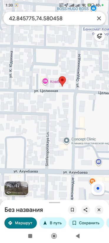 Дом с участком в центральной части города , район ул. Целинная/ул. Орджоникидзе, рядом с ул. Ахунбаева. Поблизости отмечены: Concept Clinic, банкомат, кафе.