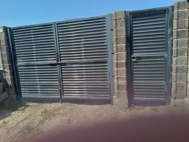 - Металлические въездные ворота распашные плюс калитка, изготовлены из профнастила с горизонтальными ламелями