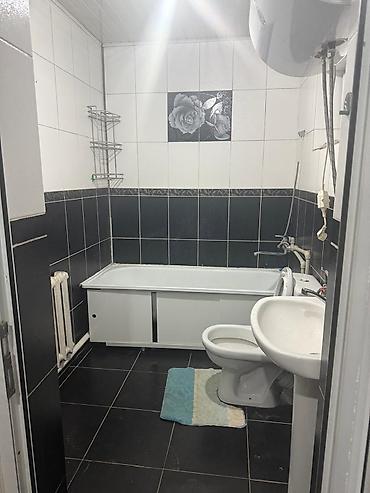 - Внутри санузел совмещённый: ванна стандартного размера, унитаз, раковина с тумбой, настенный водонагреватель, радиатор отопления. Стены и пол облицованы плиткой.