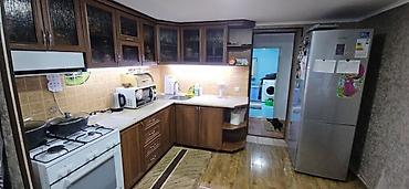 - Большая кухня-гостиная: угловой гарнитур с множеством шкафов, подсветка рабочей зоны, газовая плита с духовкой, вытяжка, микроволновка, чайник, большой двухкамерный холодильник. Обеденный стол на 4–6 персон, угловой диван, настенный кондиционер, ТВ.