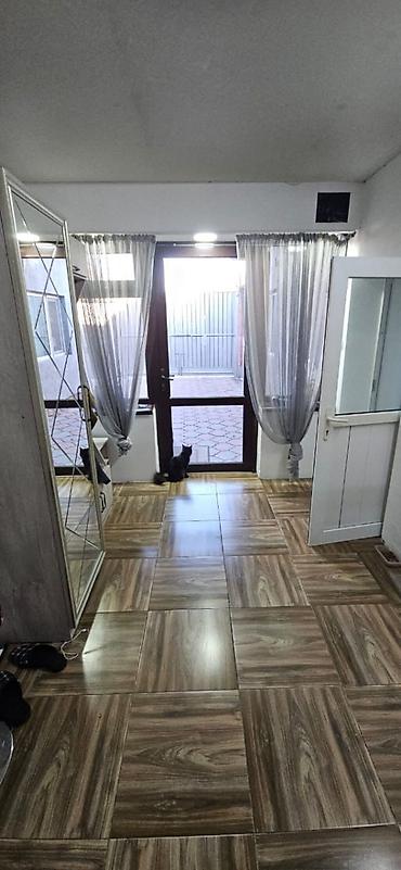 - Прихожая с выходом во двор: зеркальный шкаф-купе, керамогранит на полу, панорамная дверь и окна с легкими шторами.