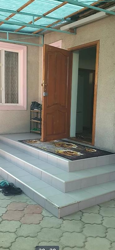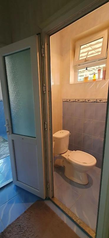 Сдается Дом 3ком кухня Кызыл Аскер без хозяев с отдельным входом и крытой верандой. Удобная широкая лестница с плиточным покрытием, металлический навес от солнца/дождя. Внутри — светлые комнаты с пластиковыми окнами, ламинат на полу, розовые стены, много естественного света. Кухня с навесными и напольными шкафами, рабочей столешницей, розетками, окном и выходом на двор; на фото видны СВЧ, мультиварка, блендер и посуда. Санузел раздельный/узел с окном, стены и пол в керамической плитке, современная сантехника, пластиковая дверь. В прихожей — коврик у порога и открытая обувница. Подходит для проживания семьи: просторная гостиная, место для обеденной зоны, наличие бытовых удобств и хорошей инсоляции помещений. Навес во дворе создает теневую зону, удобно хранить обувь и коляски у входа.