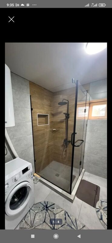 - Санузел: душевой уголок из закалённого стекла с чёрной фурнитурой, верхний тропический душ и ручная лейка, встроенная ниша для аксессуаров, керамогранит, окно для естественного света, стиральная машина, водонагреватель.