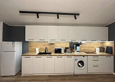 - Техника: холодильник, варочная панель, духовой шкаф, микроволновая печь, кофемашина/кофеварка, электрочайник, стиральная машина.