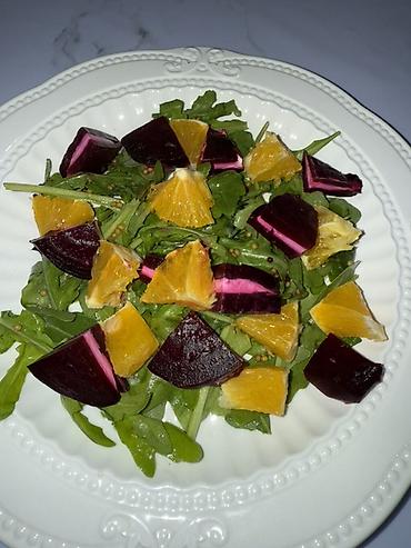 - Салат свекла–апельсин–руккола: запечённая свёкла, сочные дольки апельсина, руккола и зёрна горчицы; лёгкая цитрусовая заправка, освежающий гарнир к выпечке и мясным блюдам.