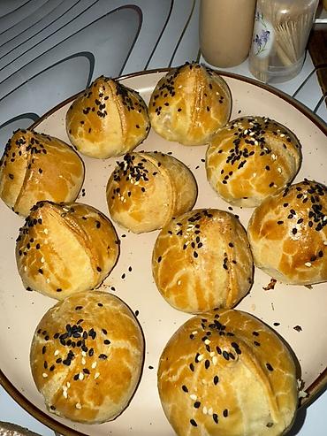 - Самса/пирожки из слоёного и дрожжевого теста: румяные, с хрустящей корочкой, посыпаны белым и чёрным кунжутом. Начинки по вкусу (классические мясные/овощные/сырные — на выбор). Подходят для обеда, перекуса и фуршетов.