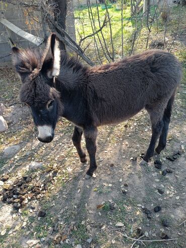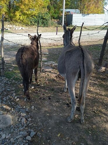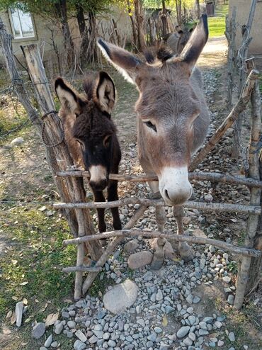 Комплектация на фото: два осла (взрослый и молодой). Расположены в сельском подворье с ограждением.