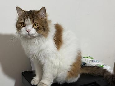 Пушистый домашний кот с густой полудлинной шерстью и выразительными янтарными глазами. Окрас бело-рыжий с коричневатыми отметинами: белая мордочка и грудь, симметричные пятна на голове и по бокам, пушистый тёмный хвост. Компактное крепкое телосложение, широкие щёки, маленькие округлые уши. Спокойный, уравновешенный характер, любопытный и контактный, любит внимание и нежные поглаживания. Подходит для квартирного содержания.