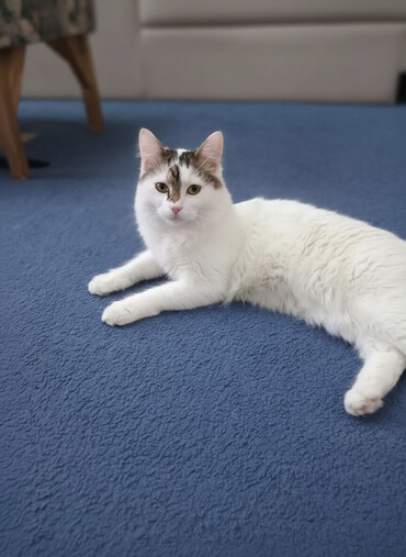 - Дополнительно: приучен к когтеточке/игрушкам (на заднем плане видна игрушка), хорошо переносит нахождение на мягких поверхностях/ковре.