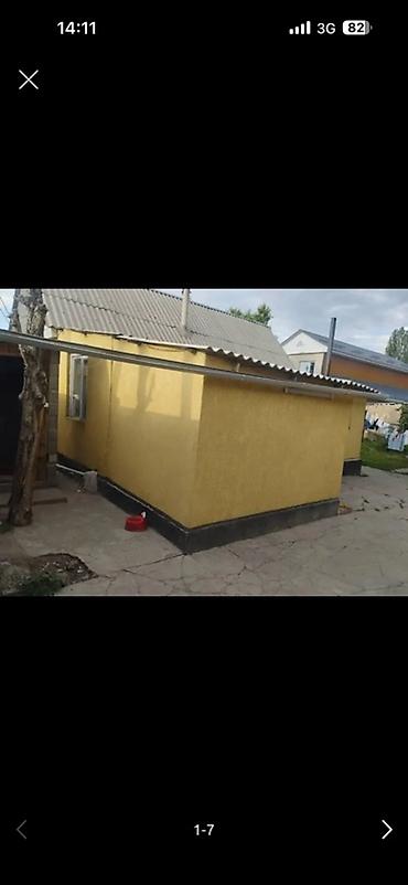 - Одноэтажный дом с наружной отделкой светло‑жёлтого цвета, двускатной крышей из профнастила/шифера. Бетонированный двор.