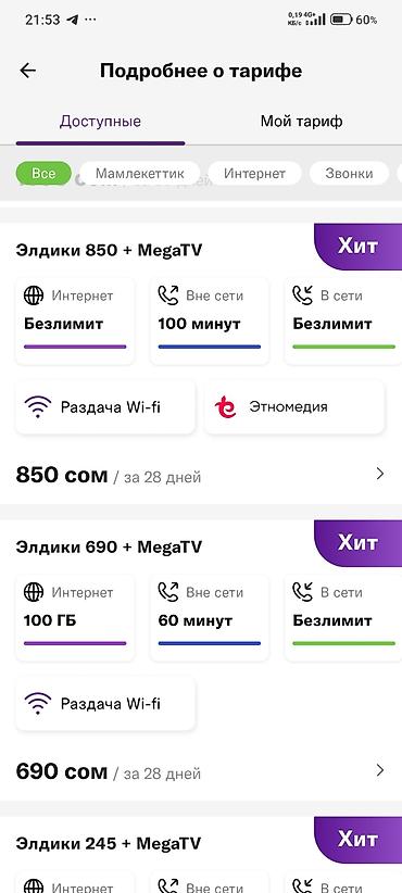 - Элдики 690 + MegaTV: 100 ГБ, безлимит внутри сети, 60 минут на другие сети, раздача Wi‑Fi. 690 cом за 28 дней.