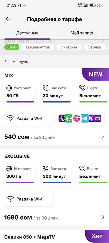 - EXCLUSIVE: 300 ГБ, безлимит внутри сети, 300 минут на другие сети, раздача Wi‑Fi. 1690 cом за 30 дней.