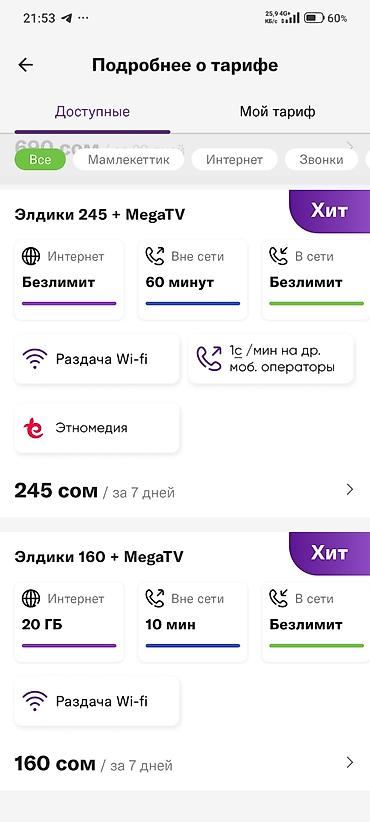- Элдики 245 + MegaTV: безлимитный интернет, безлимит внутри сети, 60 минут на другие сети, 1 с/мин на др. операторов, раздача Wi‑Fi, Этномедия. 245 cом за 7 дней.