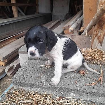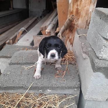 Щенок, черно-белый, короткошёрстный. Компактный, с длинными ушами и выразительными глазами. Окрас: чёрная голова с белым пятнышком на мордочке, белая грудь и лапы, на корпусе крупные чёрные пятна, кончик хвоста светлый. Лапы крепкие, корпус приземистый. Характер по фото: спокойный, доверчивый, контактный. Подойдёт как домашний компаньон: любит внимание, легко переносит объятия, готов к обучению простым командам и приучению к месту.