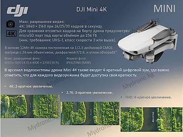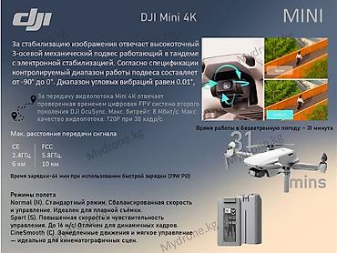 Квадрокоптер DJI Mini 4K с компактным белым корпусом и серыми складными лучами. Модель оснащена 4K-камерой с возможностью записи видео в разрешении 3840x2160 при 24/25/30 кадрах в секунду. Поддерживается 4-кратный цифровой зум, при этом для каждого видеорежима доступна своя кратность. Камера имеет 1/2.3-дюймовую CMOS матрицу и 24-мм объектив с диафрагмой f/2.8. За стабилизацию изображения отвечает высокоточный 3-осевой механический подвес. Время работы на одном заряде составляет до 31 минуты. Дрон оснащен цифровой системой передачи видеосигнала OcuSync 2.0.