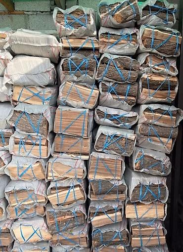 - Порезанные и колотые поленья, аккуратно уложены в мешки из плотного полипропилена, стянуты шнуром/стреп-лентой — удобно переносить и хранить.