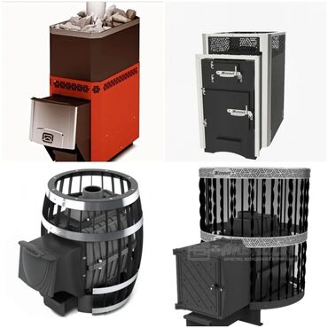 - Банные печи для саун и русских парных: открытые и закрытые каменки, печи в декоративных кожухах (бочка, цилиндр, решётка), выносные топки.