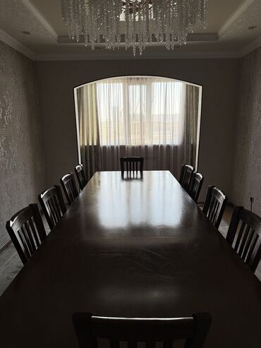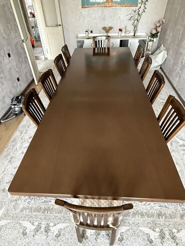 Продается большой раскладной стол в классическом стиле + 12 стульев. - Стол прямоугольный, с фигурными скруглёнными углами. Шпон под дерево с геометричным наборным рисунком и темной инкрустацией п...