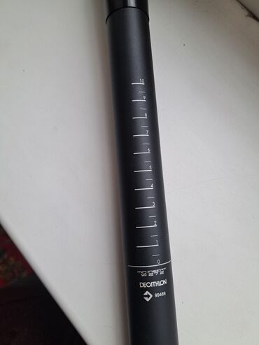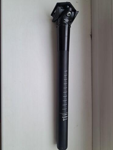 Регулируемый подседельный штырь для велосипеда с выносным управлением. Характеристики: - Диаметр: 31.6 мм (маркировка на корпусе). - Ход: 100 мм (шкала на штанге). - Управление: тросовый удалённый...