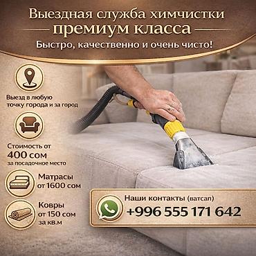 Мебельдерди, дивандарды жана килемдерди химиялык тазалоо. Шаардын каалаган жерине акысыз барабыз! Профессионалдык химиялык тазалоо менен ар кандай тактарды, жагымсыз жыттарды кетиребиз, гарантия м...