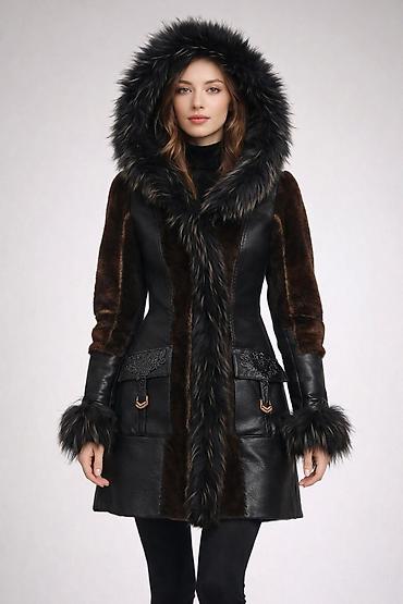 Шуба из натурального меха, классический прямой крой. Цвет: насыщенный тёмно‑коричневый/чёрный с благородным блеском. Длина до середины бедра, длинные рукава. Тёплый воротник‑стойка/полустойка, заст...