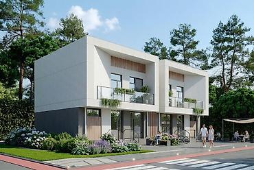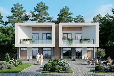 Дуплекс в современном минималистичном стиле с панорамным остеклением и балконами. Два независимых блока зеркальной планировки, каждый — с собственным входом, террасой/крыльцом и озеленённым балконом. Фасады комбинируют светлые панели и вставки под дерево, предусмотрены декоративные кашпо и места для уличного отдыха. Благоустроенная своя прилегающая территория 1,5 соток