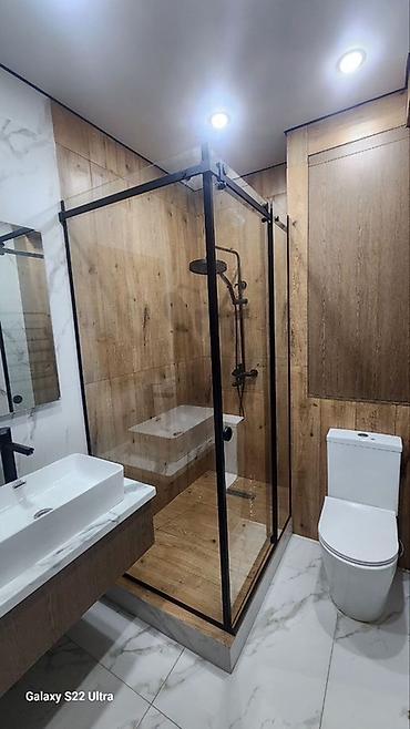 - Поддон на подиуме с покрытием “под дерево” и линейным трапом для быстрого отвода воды.