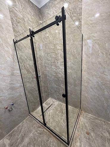 - Конструкция: угловая душевая зона с двумя глухими стеклянными стенками и одной раздвижной дверью.