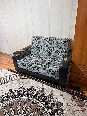 - Дизайн: комбинированная обивка — ткань с цветочным узором (серо-черная гамма) и боковины/подлокотники под темную экокожу.