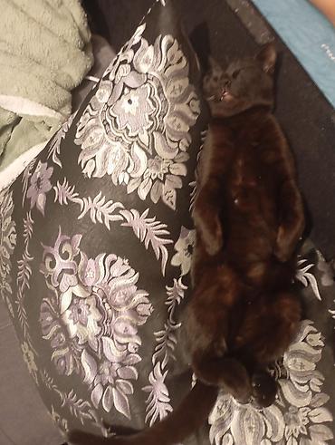 - Одна кошка — гладкошерстная, угольно‑чёрная, с выразительными жёлтыми глазами и аккуратной мордочкой. Ласковая, любит спать на спине, с удовольствием устраивается рядом с человеком, спокойно переносит объятия.