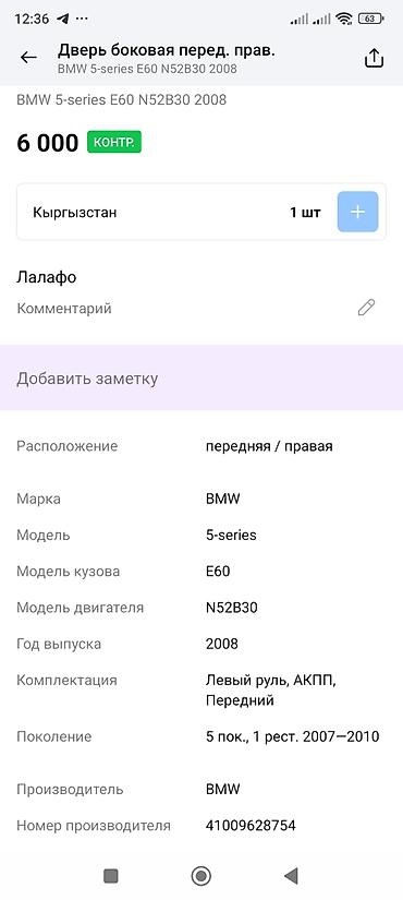 Подходит для BMW 5‑series кузов E60, двигатель N52B30, 2008 г. Цена на фото: 6000 (указана как «контр.» в карточке). Локация: Кыргызстан (согласно карточке).