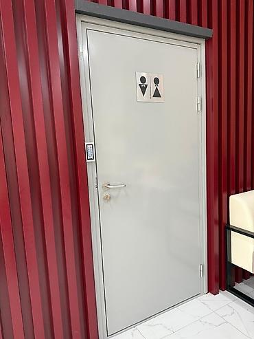 3) Гладкая однопольная дверь с порошковым покрытием (светло‑серая), табличка для санузла, кодовая клавиатура доступа сбоку, врезной замок, нержавеющая ручка.