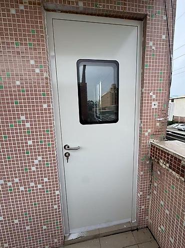 4) Наружная/входная однопольная дверь с порошковым покрытием и смотровым окном, цилиндровый замок с ключом, устойчива к влаге, подходит для выхода на улицу/технических зон.