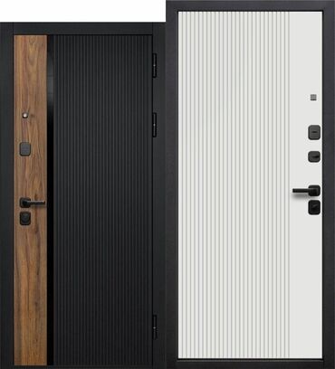 Входная дверь с отделкой под дерево и вертикальными полосами. Черная