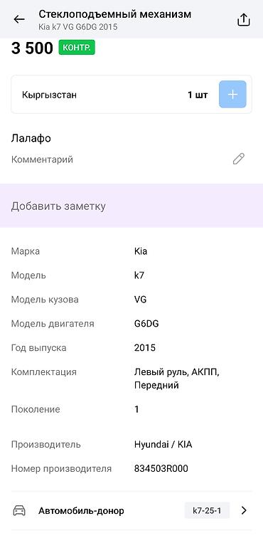 - Kia K7 (первое поколение, кузов VG, 2015 г.; также подходит к ряду модификаций VG — сверяйте по номеру 834503R000)