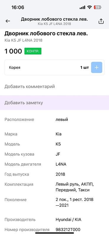 Предлагается дворник лобового стекла, предназначенный для автомобиля Kia K5, модель кузова JF, с двигателем L4NA, 2018 года выпуска. Данная запчасть произведена компанией Hyundai / KIA и имеет номер производителя 983212T000. Подходит для автомобилей с левым рулем, автоматической коробкой передач, передним приводом, а также для комплектаций, используемых в такси. Совместим с автомобилями 2-го поколения, 1-го рестайлинга, выпущенными с 2018 по 2021 год.